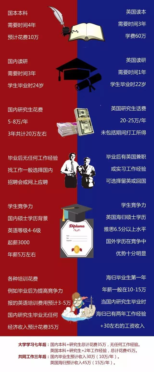 B爸爸:对啊!而且孩子在英国读的大学的排名肯定不差!关键是,我也没比你多花多少!因为我孩子提前两年工作,也能赚回来一些了。基本上,7年以后,咱俩成本差不多,可我的孩子工作起点高,这个明显优势就不一样了!!!
